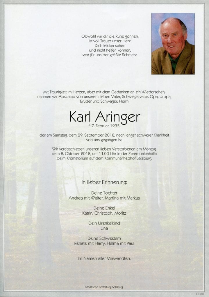 Karl war aktiver und erfolgreicher Sportler im Verein und auch lange im Präsidium des Gesamtvereines als Sektionsleiter der Fußball AH tätig. Der ASV Salzburg wird Karl Aringer stets ehrenvoll gedenken!
